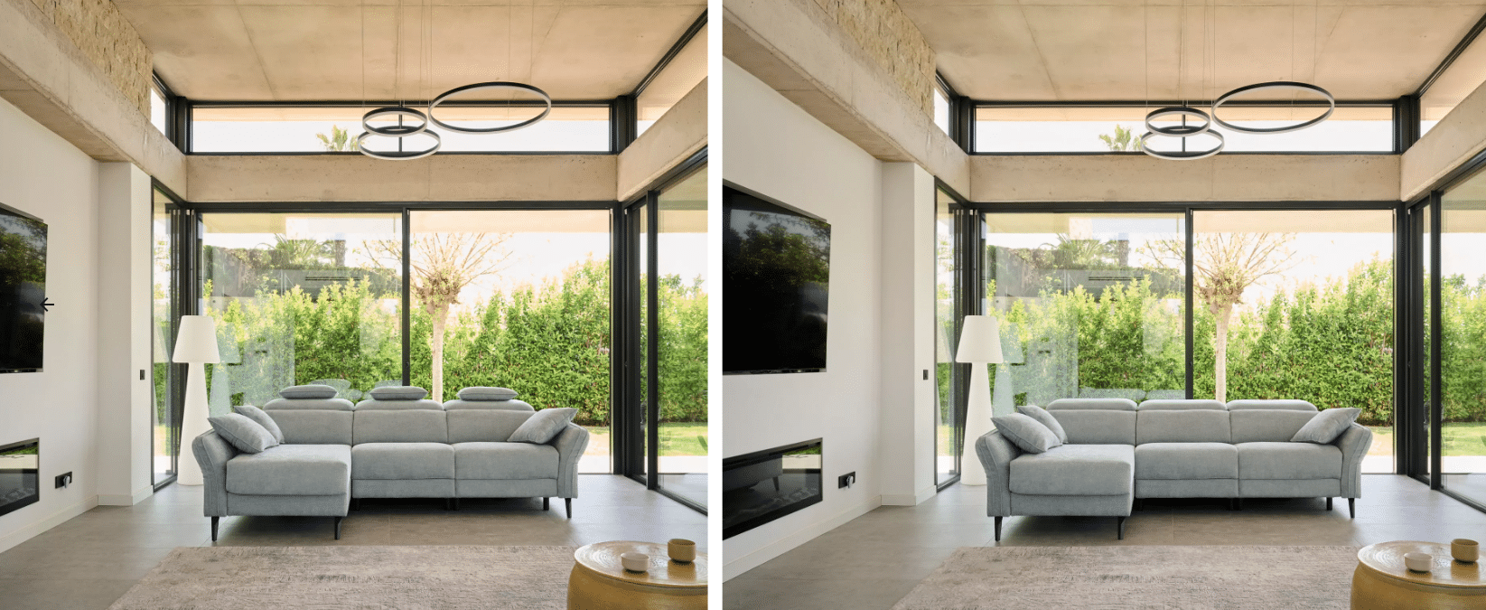 El módulo chaiselongue incorpora un sistema deslizante eléctrico con arcón, ideal para disfrutar del confort extra y ganar espacio de almacenaje.